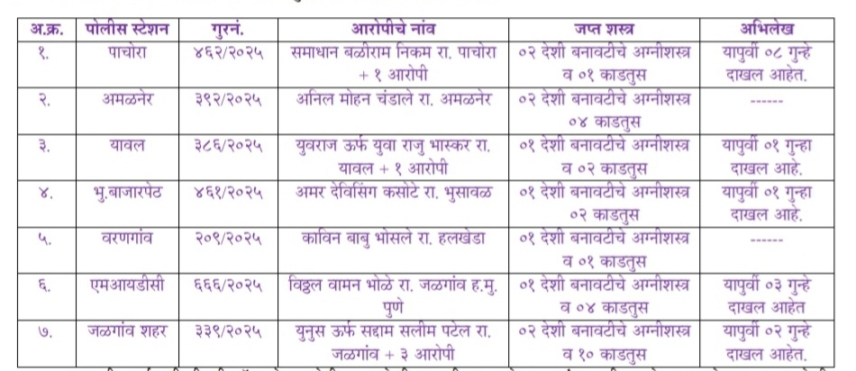 जळगाव, (प्रतिनिधी) : जिल्ह्यात गंभीर गुन्ह्यांना प्रतिबंध घालण्याच्या दृष्टीने, पोलीस अधीक्षक डॉ. महेश्वर रेड्डी यांच्या आदेशानुसार, जळगाव जिल्हा पोलीस दलाने १६ ते ३० सप्टेंबर या कालावधीत अवैध अग्नीशस्त्रांविरुद्ध विशेष मोहीम यशस्वीपणे राबवली.
