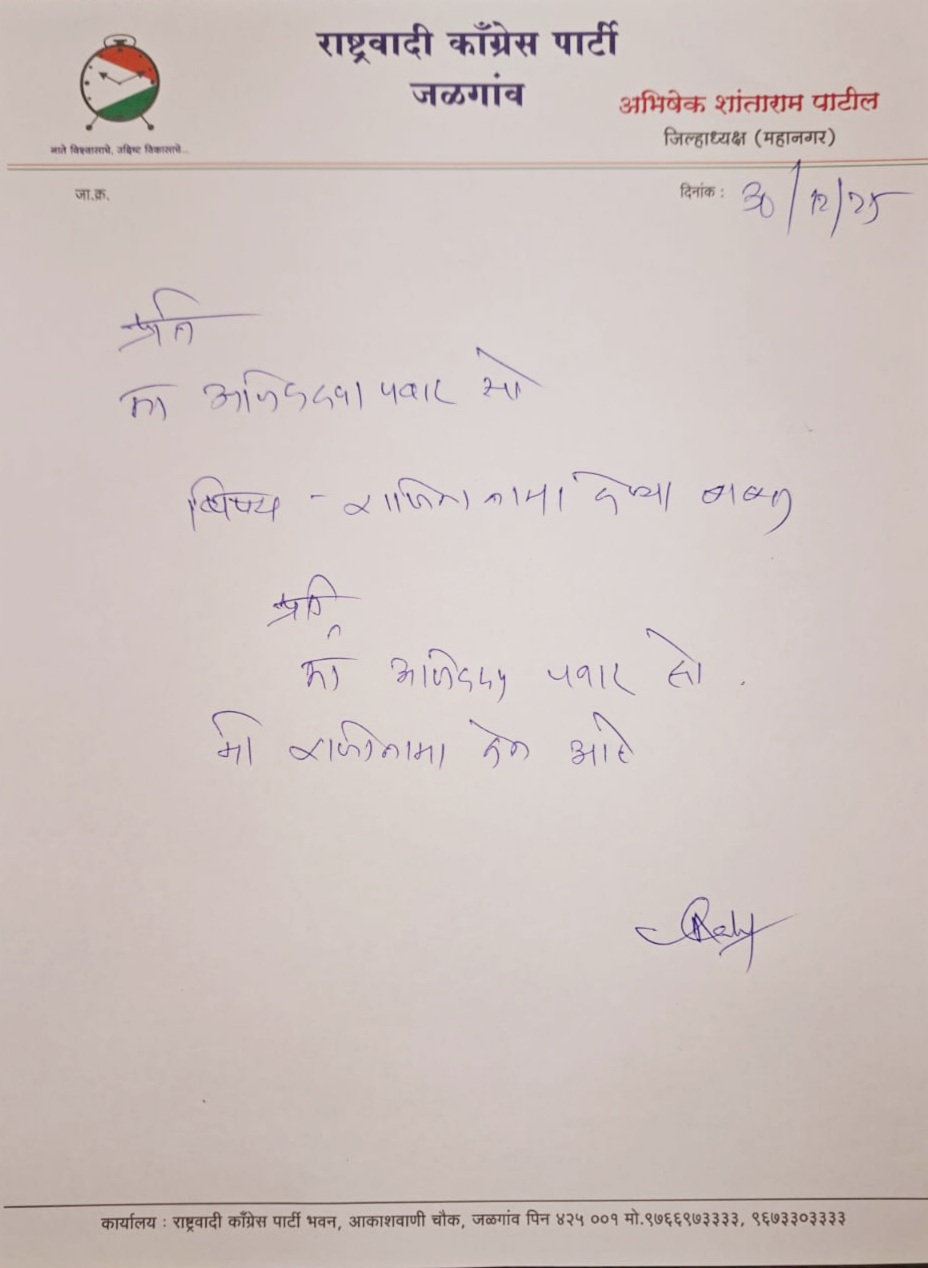 गेल्या काही दिवसांपासून महायुतीमध्ये भाजप, शिवसेना (शिंदे गट) आणि राष्ट्रवादी काँग्रेस (अजित पवार गट) यांच्यात जागा वाटपाचा तिढा सुरू आहे. जागा वाटपाचे चित्र स्पष्ट होण्यापूर्वीच आणि अर्ज भरण्याच्या अखेरच्या दिवशी अभिषेक पाटील यांनी राजीनामा दिल्याने राष्ट्रवादीच्या गोटात मोठी अस्वस्थता निर्माण झाली आहे. उपमुख्यमंत्री अजित पवार यांच्या नावे लिहिलेले त्यांचे दोन ओळींचे राजीनामा पत्र सध्या सोशल मीडियावर तुफान व्हायरल होत आहे.