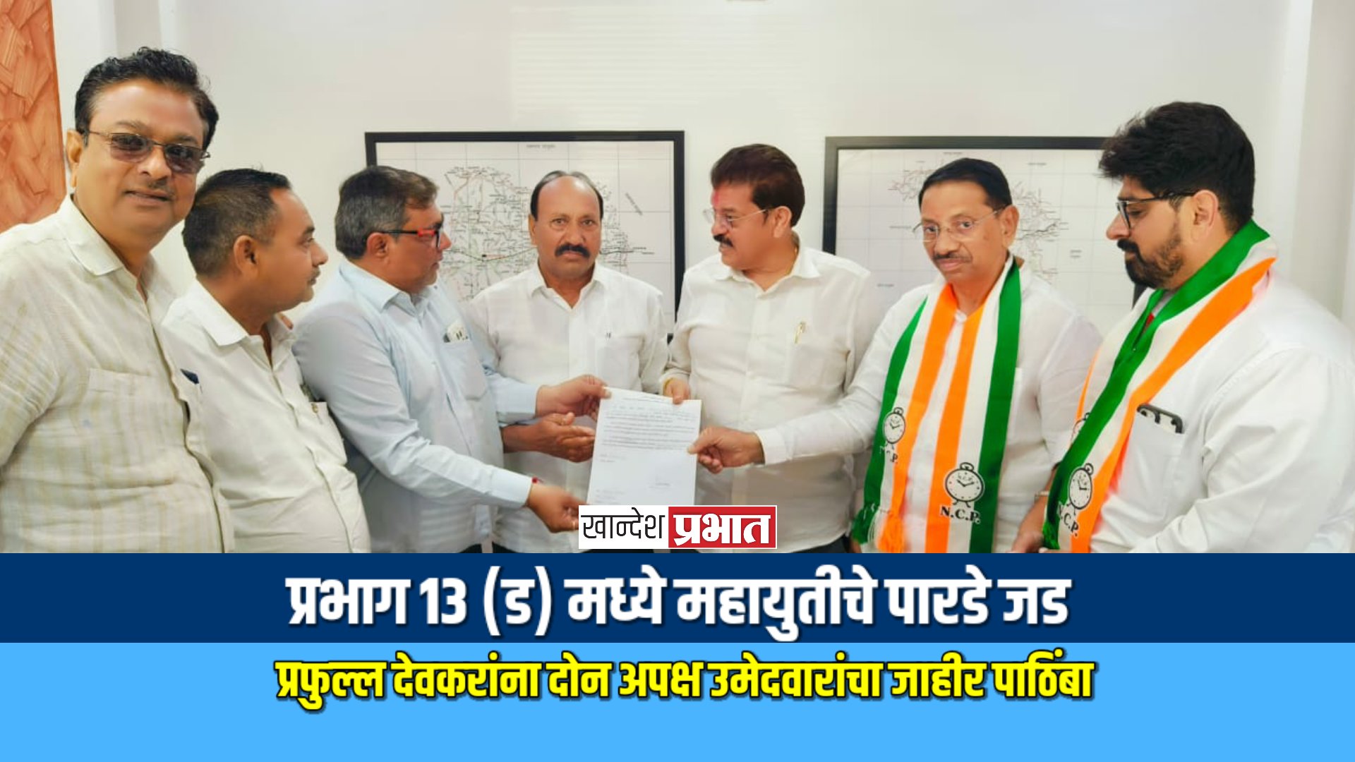या दोन्ही उमेदवारांनी प्रफुल्ल देवकर यांच्या समर्थनाचे पत्र आमदार राजूमामा भोळे यांच्याकडे सुपूर्द केले. यावेळी बोलताना प्रफुल्ल देवकर म्हणाले की, “मिळत असलेला हा पाठिंबा म्हणजे मतदारांचा महायुतीवरील विश्वास आहे. आगामी पाच वर्षांत प्रभागातील उर्वरित विकासकामे अधिक जोमाने पूर्ण केली जातील.” या निर्णयामुळे प्रभाग १३ मध्ये प्रफुल्ल देवकर यांचे पारडे जड झाले असून, कार्यकर्त्यांमध्ये उत्साहाचे वातावरण निर्माण झाले आहे.