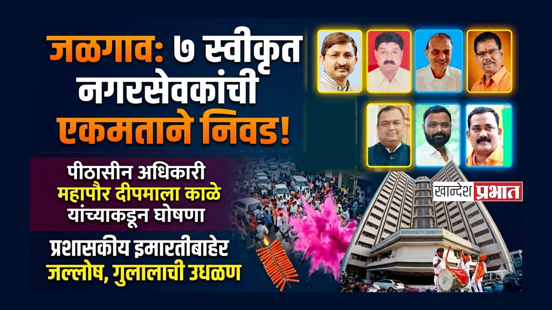 जळगाव, (प्रतिनिधी) : जळगाव शहर महानगरपालिकेतील रिक्त असलेल्या ७ स्वीकृत नगरसेवक पदांसाठी आज, बुधवारी (१५ एप्रिल) विशेष महासभेचे आयोजन करण्यात आले होते. या सभेत सर्वपक्षीय ७ उमेदवारांची एकमताने (बिनविरोध) निवड करण्यात आली आहे. निवडीची घोषणा होताच महापालिका प्रशासकीय इमारतीच्या प्रांगणात कार्यकर्त्यांनी ढोल-ताशांच्या गजरात आणि गुलालाची उधळण करत जोरदार जल्लोष केला.