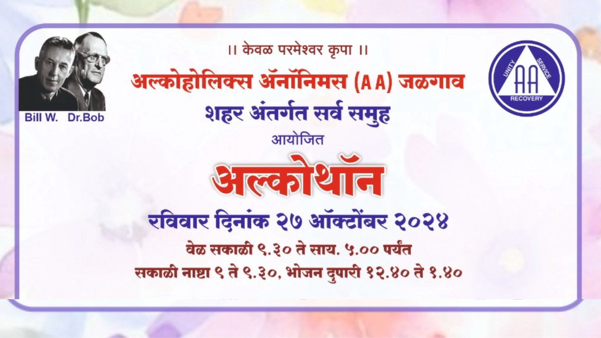 जळगाव, (प्रतिनिधी) : अल्कोहोलिक अनॉनिमसचा भाग असलेल्या जळगाव अंतर्गत सर्व समूहाच्यावतीने “मद्यपाश एक जीवघेणा आजार” या विषयावर अल्कोथॉन कार्यक्रम व जनजागृती कार्यक्रम रविवार दि. २७ ऑक्टोबर रोजी सरदार वल्लभभाई पटेल सभागृह (लेवा भवन) येथे सकाळी ९. ३० ते ५ या वेळेत प्रमुख पाहुण्यांच्या उपस्थितीत आयोजित केलेला आहे.